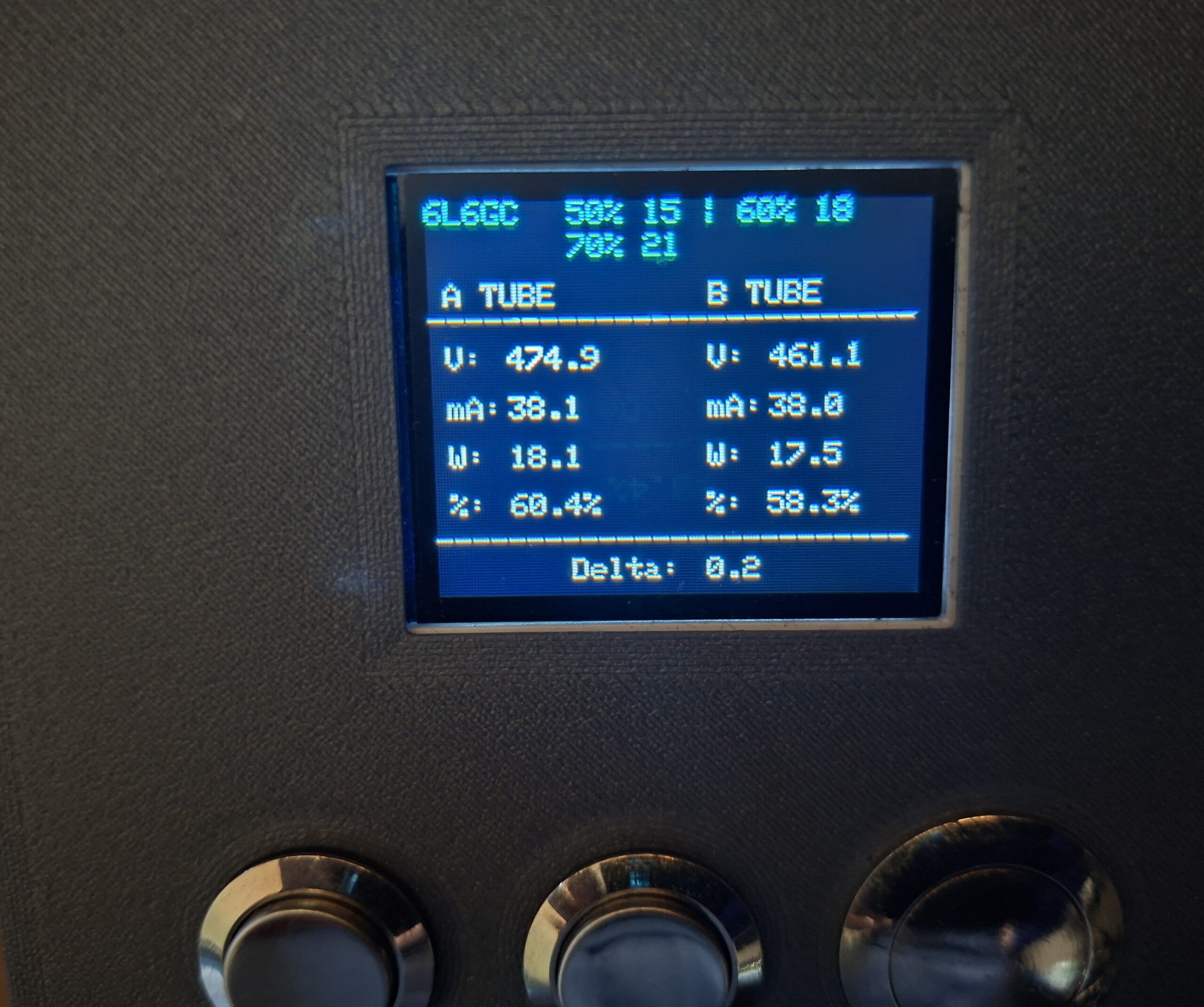 This project is a professional-grade, open-source Arduino tool that allows for the precise measurement and setting of bias for power tubes (EL34, 6L6GC, 6V6, KT88, etc.) using a high-resolution color interface. Unlike simple multimeters, this tool calculates Plate Dissipation (Wattage) in real-time, ensuring your amplifier runs at its optimal operating point safely and accurately.